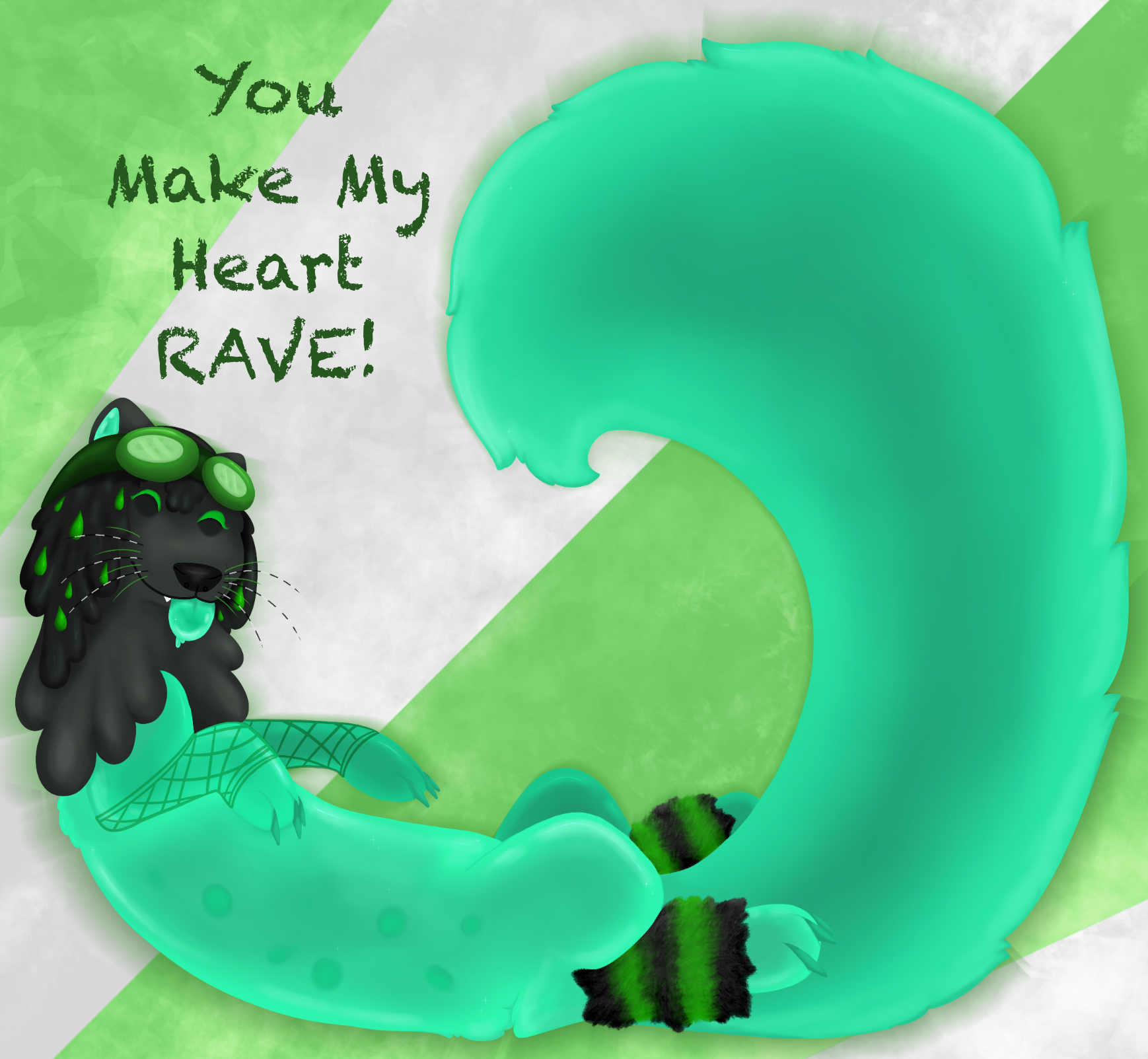 [ID: a drawing of my oc Neora. she is curled up slightly while playfully doing a blep. some text above her says "you make my heart rave" in reference to her cybergoth theme]