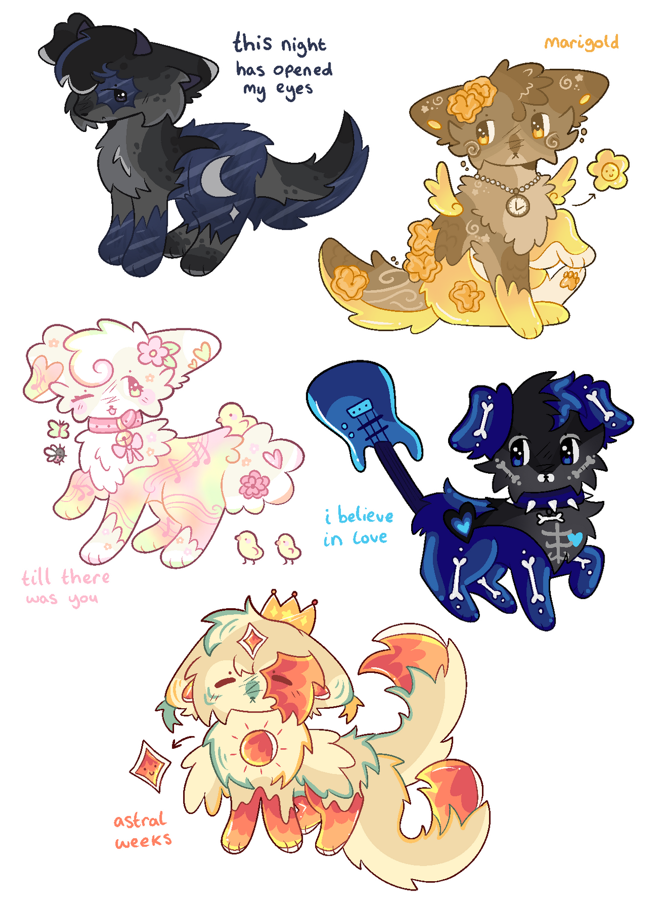 Hi everyone, fennecbug here with my first ever adopt batch! All of these adopts are based off of my favourite songs!